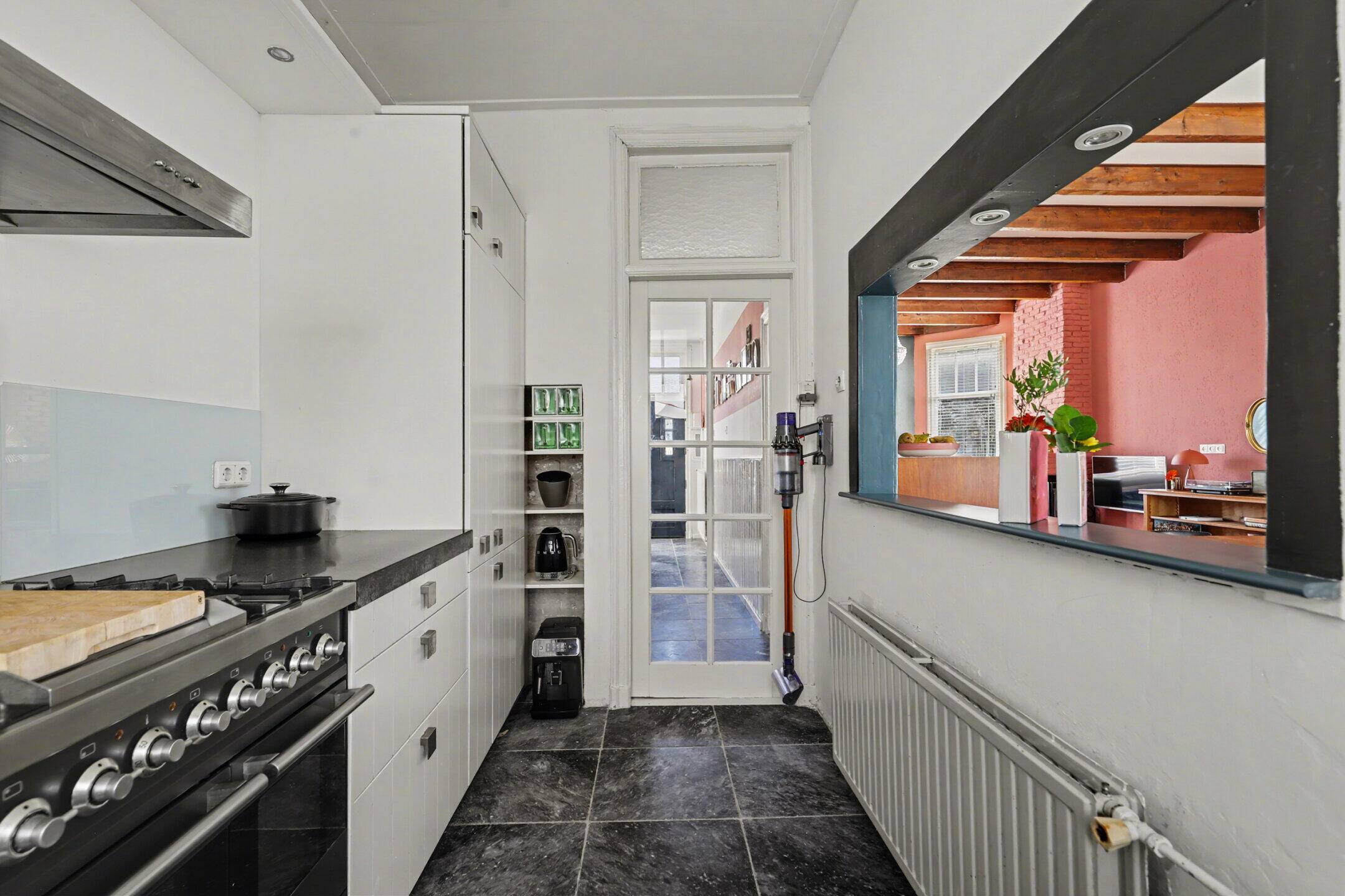 Begane grond: door de breedte van de woning is de hal voorzien van een lambrisering en lekker ruim (en licht). Grote trapkast en een fraaie toiletruimte. De woonkamer is 8,5 meter diep en met dubbele tuindeuren verbonden aan de overkapping en de tuin. De sfeervolle woonkamer is voorzien van een balkenplafond, een haardpartij en is verbonden met een halfopen keuken, uitgevoerd met een praktische hoekopstelling en voorzien van ingebouwde apparatuur.